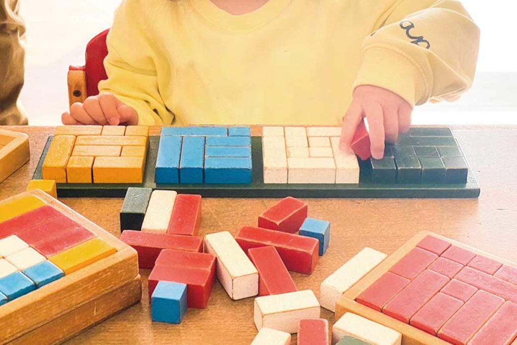 独自に考案された様々な積木を用いた活動です。カリキュラムに応じて、たくさんの積み木の中から自分で選んで、様々な模様や図形を作ります。お子さんにとっては遊びのように感じる時間ですが、たくさんの積み木を作り上げる中で、図形や記号、概念などのすべての分野に渡って「自分で考える」力がついてきます。将来必要となってくる思考力や集中力、持続力が養えます。- 算数